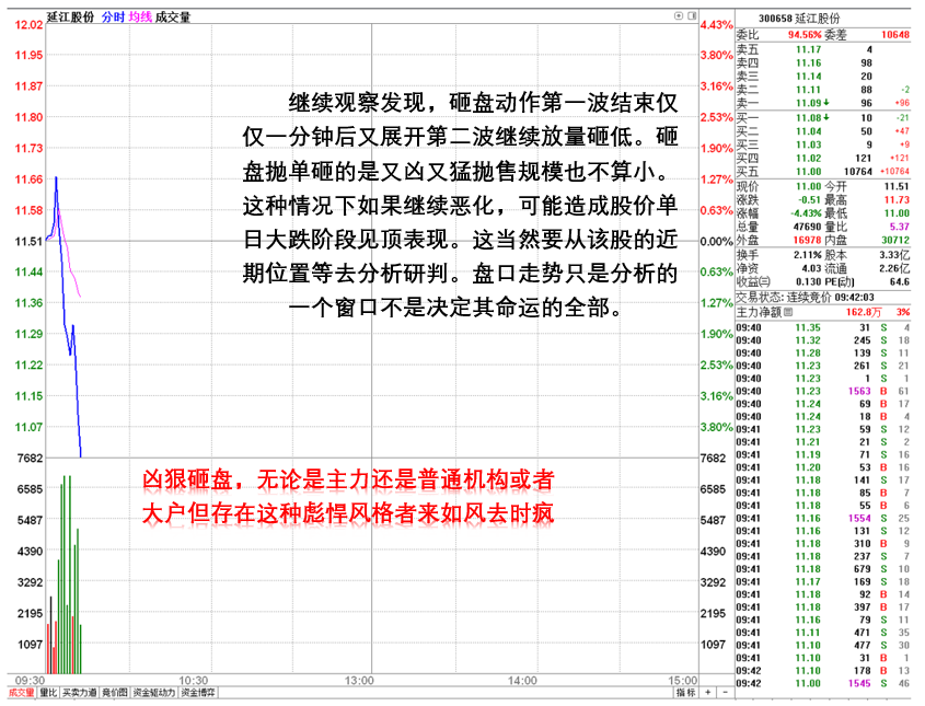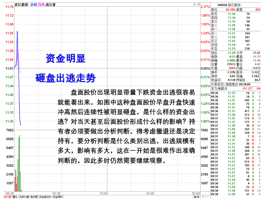 当个股庄家或大主力开始出逃卖出时,股价受到下跌影响会持续一天几天甚至更长时间。原因非常简单,因为其持有筹码量大减仓或清仓卖出需要较长的时间才能卖完或完全任务,因此对股价下跌影响时时间自然较长。普通机构大户持有量少则千百万多则几千万的金额,当然也有大更多的。其卖出若是明显快速抛售影响时间从一般由几分钟至几十分钟不等。因此判断是庄家或大主力出逃卖出,还是普通机构大户出逃卖出?第一个方法是观察个股筹码明显抛售下跌的时间长短。如果只是日内股价明显带量下跌单笔卖单频繁出现,盘面只有几分钟至几十分钟带量下跌是普通大户机构机会大。较短时间下跌后就出现分时止跌走稳明显反抽,盘中没继续出现频繁大额单笔卖单频繁砸盘。这种情况一般属普通机构大户出逃卖出,出完或者达到目的后砸盘动作就停了。明显砸盘出逃动作停止。盘面恢复正常状态分时就会走稳。