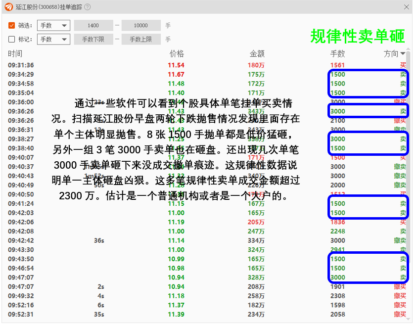 砸盘出逃筹码量的大小也是判断出逃者是谁的分析要素。个股活跃程度,流通盘,价格高低各不同,日常交易单笔金额和手数有很大的差异。根据盘面抛单情况大概统计单笔手数过千手,金额达到50万以上的单笔卖单数量总,通过推算砸盘期间抛单量揣摩是什么性质资金在抛。阶段抛出金额三两千万的一般是定义为普通机构大户,近亿过亿的主体就是大主力。被统计这些抛单肯定存在部分是其它机构大户的,属于估算量只是作为一种参考。