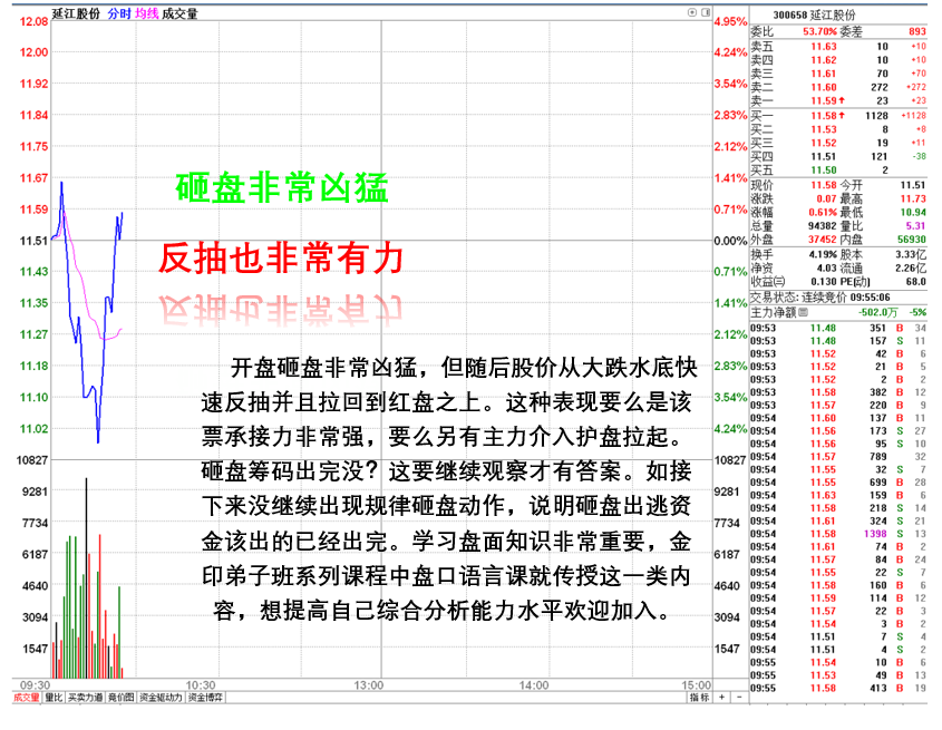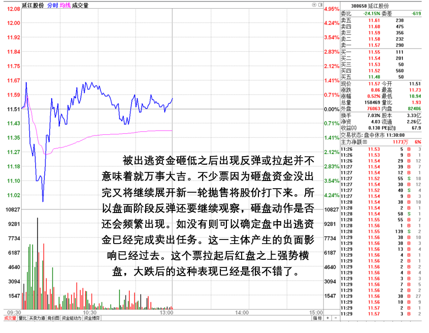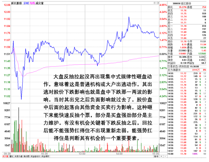 盘面阶段卖盘抛单不断股价下跌明显,普通机构大户出清完全后其负面影响力就过去了。盘面弱的股价稳住止跌,强的很快就会出现明显弹,更强的回抽推高到红盘走上升状态。如果是从中寻找机会肯定是找能快速回拉到红盘之上的为最好。