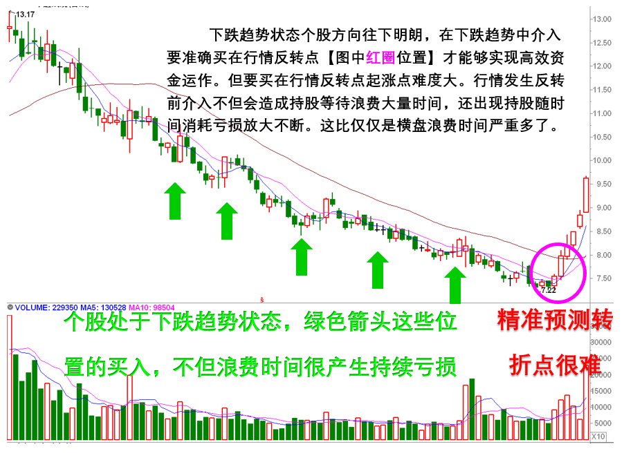 个股日K线走势整体处于下跌趋势状态,如在下跌趋势状态选择介入,介入节点要精准的买在该股下跌趋势下跌见底时间节点。如在下跌趋势下跌见底前就已经早买,持股股价继续下行将会导致账面出现不断亏损越拿亏损越严重。要精准选出个股下跌趋势完毕,发生转势往上转折点难度很大。抄底形成下跌趋势的个股在逻辑风险明显更大。