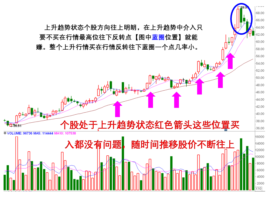 个股上涨日K线形成上升趋势形态,说明该股上涨已经走出一段方向明朗上升走势。这类个股此时无须再去预测股价方向会不会往上了,因为上升走势中的股价方向毫无疑问就是往上。此时观察目标上升方向会不会停止上行出现转折往下才是要做的工作。寻找已经形成上升趋势往上方向明朗的个股为目标介入,持股消耗的时间是股价上升有效做功时间,消耗的时间越长股价理论涨幅越大。一路上行即可一路拿,最不怕最有价值的就是这种时间消耗。