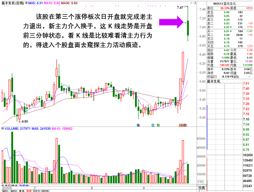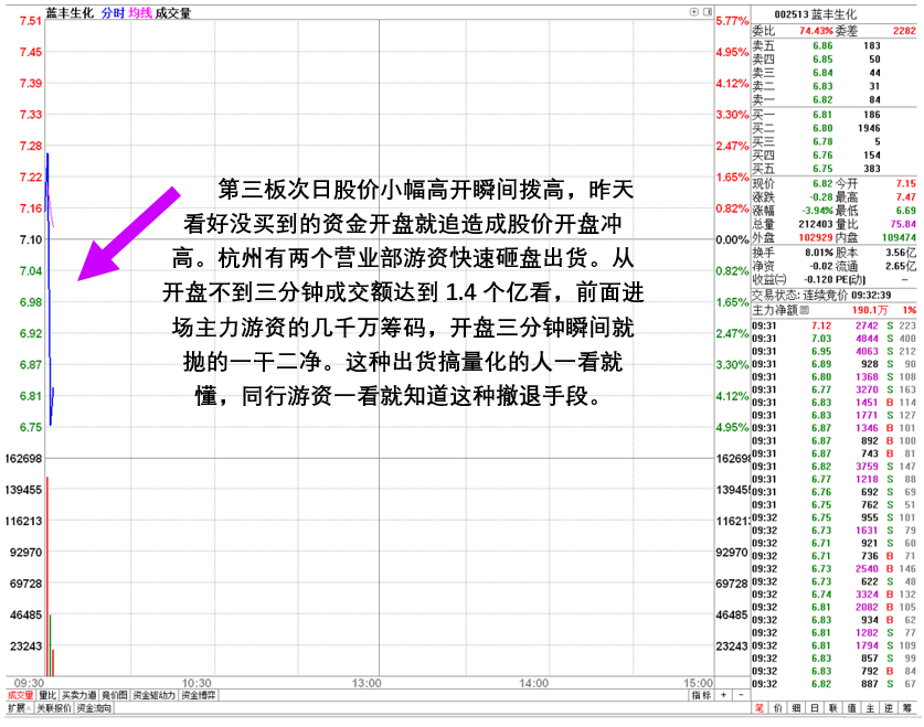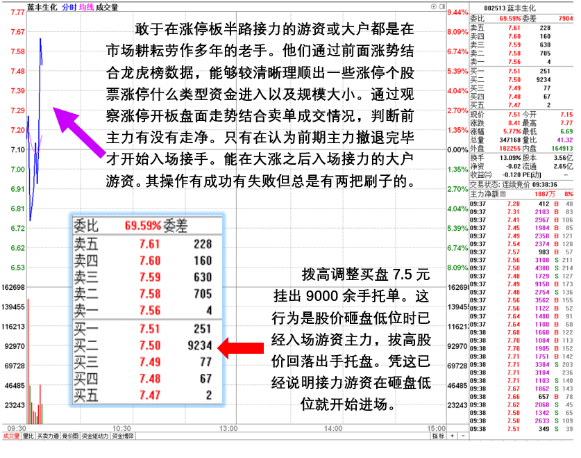 连板票中出现开板时,游资介入接力选票和介入都是有技巧的。大量游资接力一般选二连板三连板居多。这类个股连板数不多风险不算特大,重要的是人气已经汇聚起来这相对一个被别人捂热的窝。接力游资选择超短线游资风格或程序化游资所发动的个股为主。因为这两类游资操盘品种大都是做高一两个涨停板空间就达到目的,他们不贪不恋战撤退当日大都一股不留。涨停板开板全仓快速出货不留尾巴不留后手是他们的优点,中途接力入场游资不受前者干扰。这是一种精干思维,各路资金各做一段前者后者互不干扰自成一派。经验丰富的主力选对标的入场接力做到楚河汉界泾渭分明。