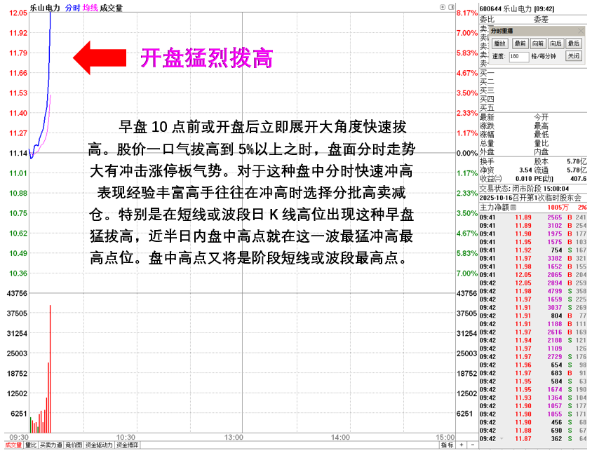 个股早盘10点前股价分时走势出现60度角猛烈拔高走势,这股价快速拉升是利润来源重要时段,但同时这种盘面走势也暗藏危机。早盘分时大角度快速冲高很容易出现一波猛烈拉升后形成短线或阶段顶部最高点。盘面分时走势一气呵成快速上涨超过5%或更大涨幅,然后一口气快速砸回到全程涨幅剩余不足1/3涨幅价格位置。接下来股价反弹无力下行一波比一波低形成盘中分时见顶姿态。砸盘后走势反弹无力,股价经过两到三波下跌将前面这波快速拉升涨幅全部吞没,甚至还直接砸到绿盘之下并不少见。这种盘面无论是第一天拉升还是短线已涨多天,又或者在波段高位出现都容易形成阶段顶部。下面通过实践经典案例,以个股盘面分时走势一步一步演绎读解这一盘口见顶判断技术。