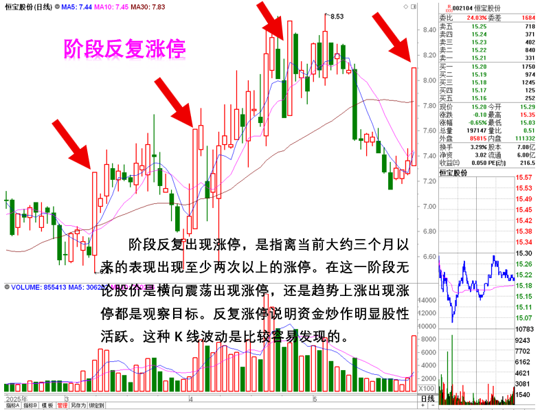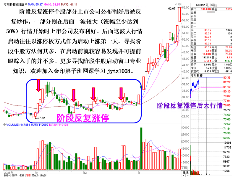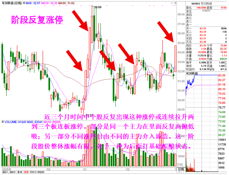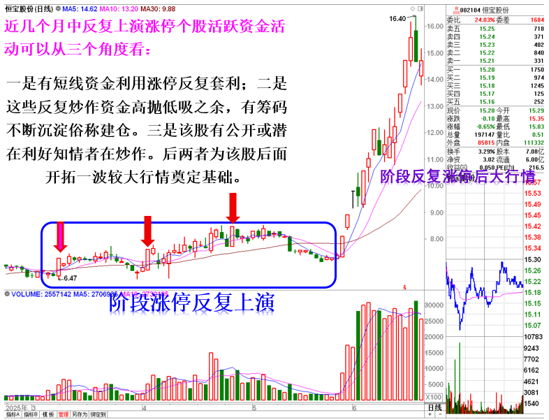 实战发现阶段大涨翻牛股相当多在连续大涨前,都曾出现有反复涨停板或拉出多个连板涨停现象。前期或近期反复出现涨停板个股,更容易走出阶段涨势更强涨幅更大的牛股或妖股。