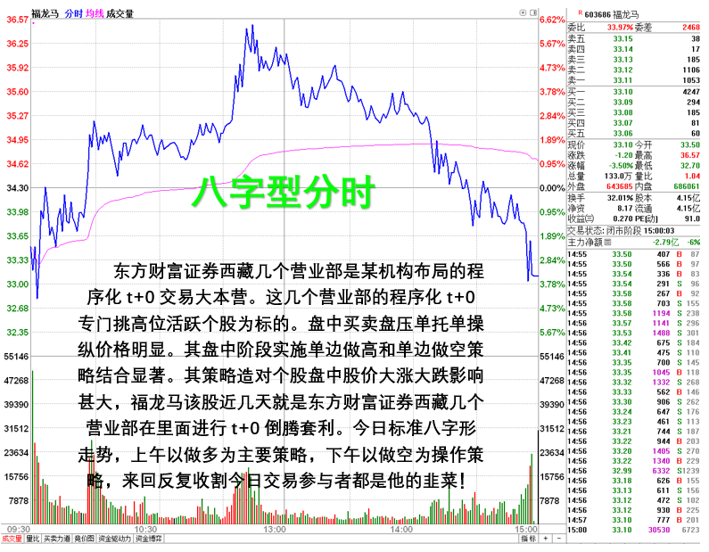 统计从交易所数据和大量龙虎榜数据上个股日内出现成交额较大的t+0品种。发现个股存在明显的t+0盘中阶段持续往上推高,做高到一定程度又持续往下做空现象。盘面走势全天整体分时呈现上午阶段单边震荡上扬,下午阶段单边震荡下跌分时如八字形态。或是盘中上午阶段持续做空下跌,砸到一定程度下午阶段转向持续做多震荡上升走势,分时形成v字形形态表现。无论分时八字形还是v字形形态,这两段走势机构都是利用资金筹码融资融券控制性实施t+0操作套利。这与庄家控盘式操纵股价涨跌本质上没有什么区别。量化程序化T+0的名称为其逃避规律法规的监管和处罚。