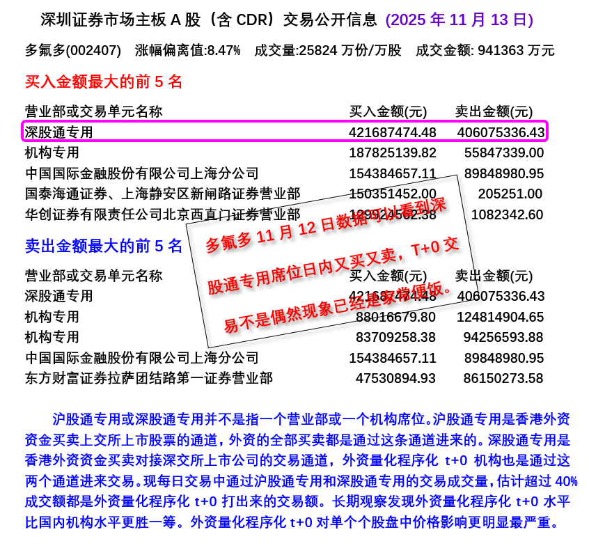 另外了解有量化程序化t+0交易个股可以看每日涨跌停龙虎榜数据榜公布情况。龙虎榜数据榜中单个营业部或单个机构席位,当天既有大量买有大量卖这种就是t+0交易。沪股通和深股通外资进来每日也有大量的t+0回转交易,他们在这一块做到了登峰造极状态。