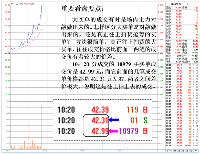 必要时还应该看盘中买单的成交情况,一般看大买单的成交为主。另外看有没有出来大量有规律的买单。如500手,1000手, 2000手——这样的整数买单。部分机构吸筹时经常用这些整数或者单笔数值比较接近的买单有规律拿货。
