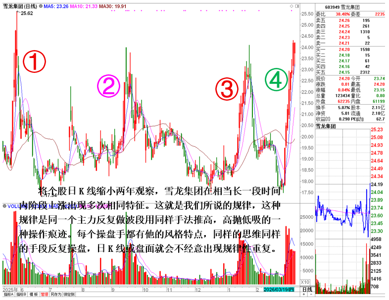 找中小盘股中有主力控盘运作品种,日K线级别看日K走势有一定的规律可寻。控盘品种大部分日K线阶段表现怪异,阶段走势明显有人为控制操纵的特点。譬如在某段时间内短线或波段日K线走势出现长上影或大阳线大阴线等规律表现。 找规律是分析判断有没有主力长期控盘炒作的重要技术判断手段。