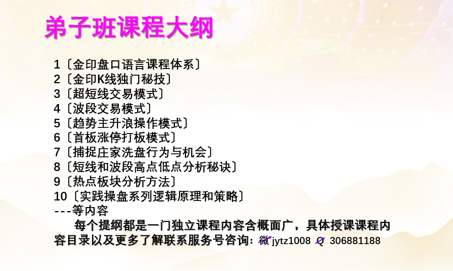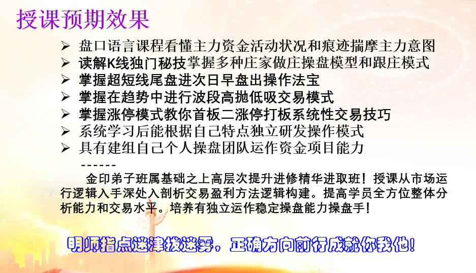 娘胎十月胎教即始,二十有余在学校朗朗读书,步入社会孜孜不倦学习成长。求学进步伴随每人一生一世! 学习两个终极目的:认知、竞争 认知提高自我层次,竞争获取更高维度回报 不断摄入新知识新思维在学习中蜕变越来越强大! 金印弟子班 金印弟子班集金印多年所学所悟知识和思维整理为多门系统性课程,集中一起授课的综合性课程。名师指点拔迷,雾授人以渔为学员改变现状翻书开拓新篇章! 转载请注明:金印投资 » 金印弟子班即将开课 喜欢 (0)or分享 (0)